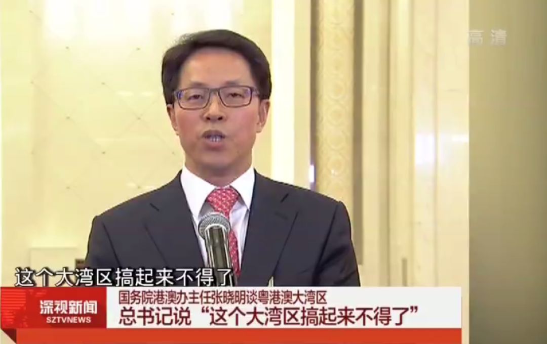 在今年两会期间,国务院港澳事务办公室主任张晓明在“部长通道”回答记者提问的时候,透露了高层对“粤港澳大湾区”的看法,大家可以看看视频截屏:
